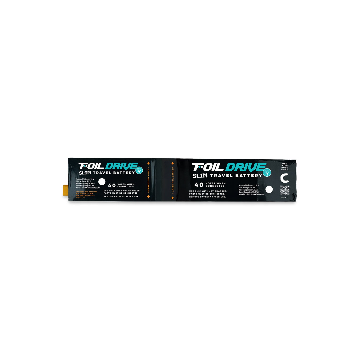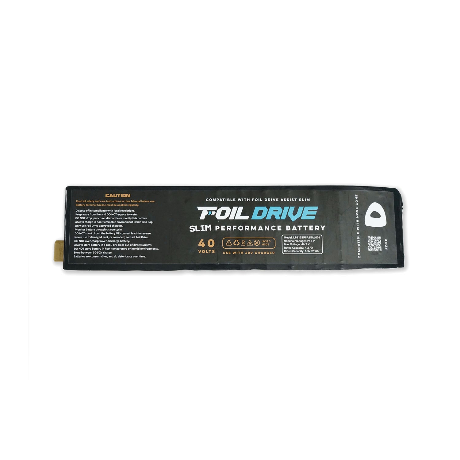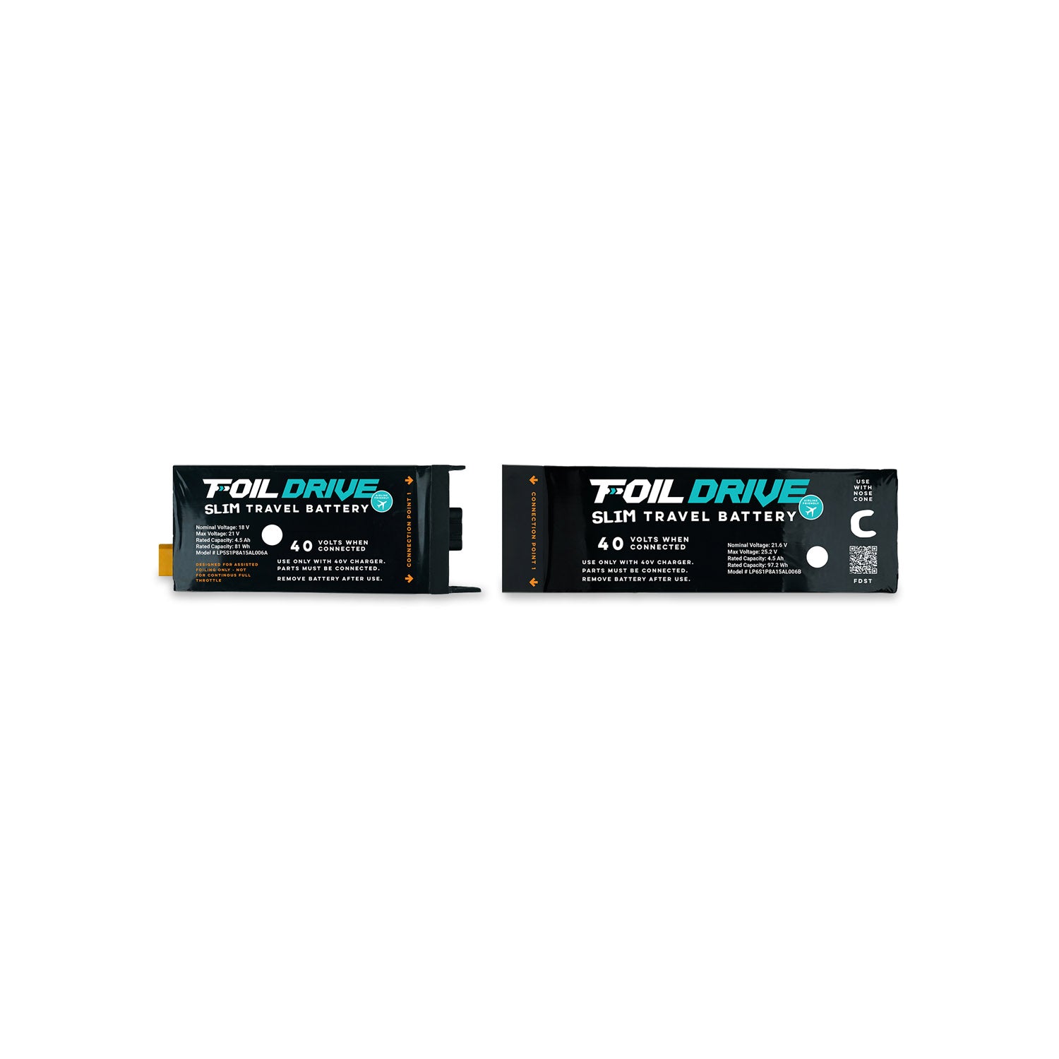 Size chart Foil Drive Slim Batteries Slim Performance Slim Travel Slim Endurance Battery Voltage 40V 40V 28V Battery Capacity 166.32 Wh 178.20 Wh 241.92 Wh Battery Dimensions 320 x 75 x 21mm 410 x 75 x 21mm 410 x 75 x 21mm Battery Weight 1.05 kg 1.25 kg 1.45 kg Energy Density 158 Wh/kg 143 Wh/kg 166 Wh/kg Airline Compliant No Yes No Fast Charger Option Not Recommended Not Recommended No Water & Dust ResistanceRating IP68 IP68 IP68